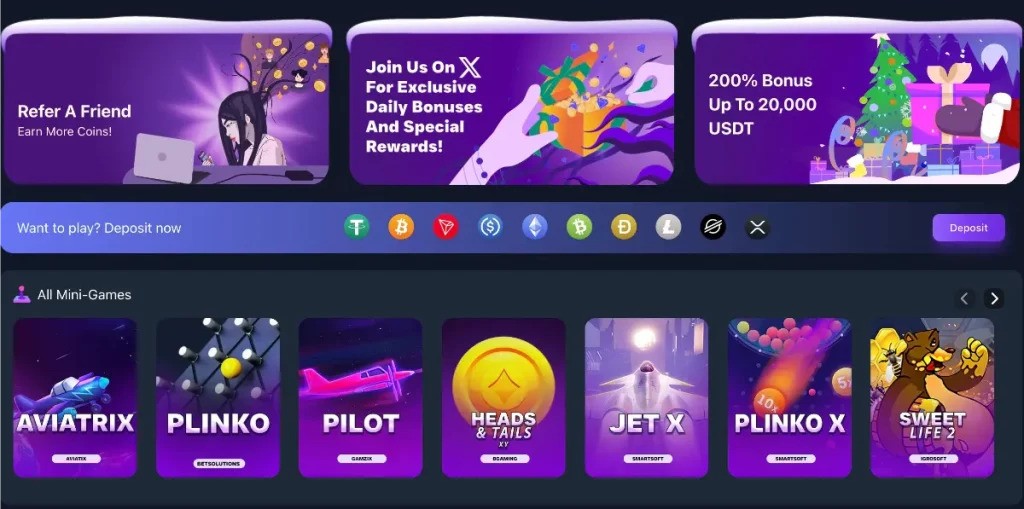 Began operating in 2023, Crypto Games focuses on a simple and provably fair experience. It supports common tokens like Bitcoin, Ethereum, USDT, USDC and Tron.