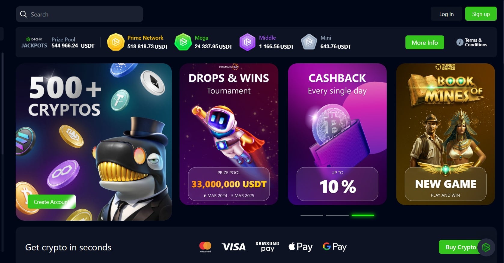 Most payments use digital coins like Bitcoin, Ethereum, Litecoin and Dogecoin, so deposits and withdrawals are fast. New players can get a very large sign-up package.